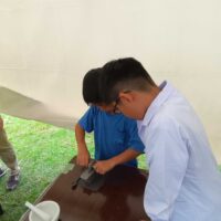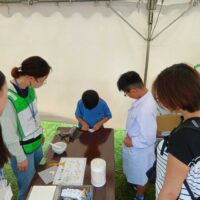 お子さんを対象に、お薬をつぶす道具”薬研”や”乳鉢”を実際に使うお薬の粉砕体験も行いました。「なぜ くすりをつぶすの?」その理由や、薬剤師のお仕事について知っていただく良い機会となりました。また、つぶした粉を専用の紙で折ってつつむ「薬包」の折り方体験も行いました。